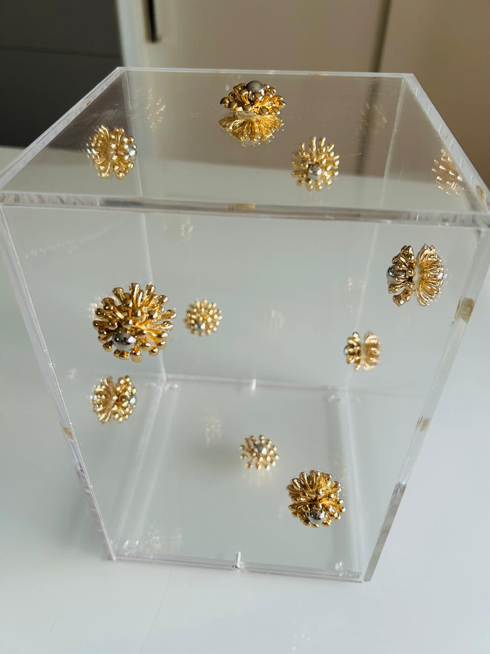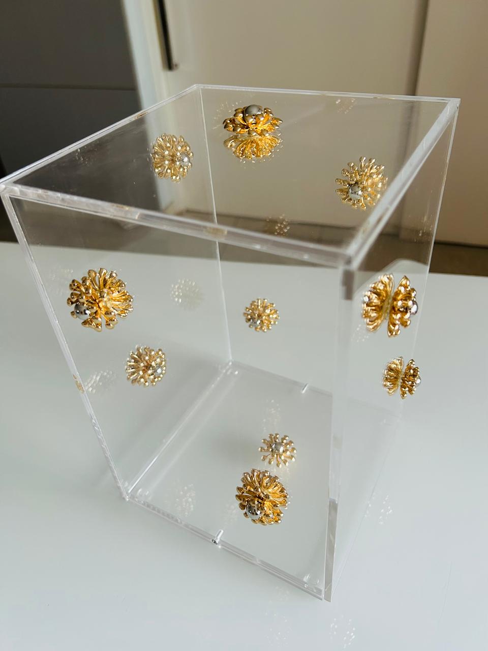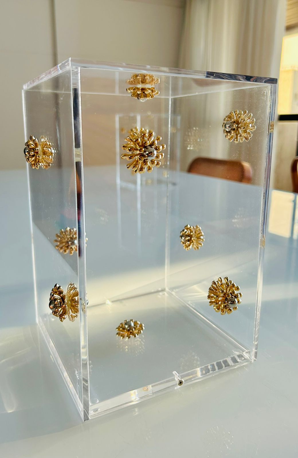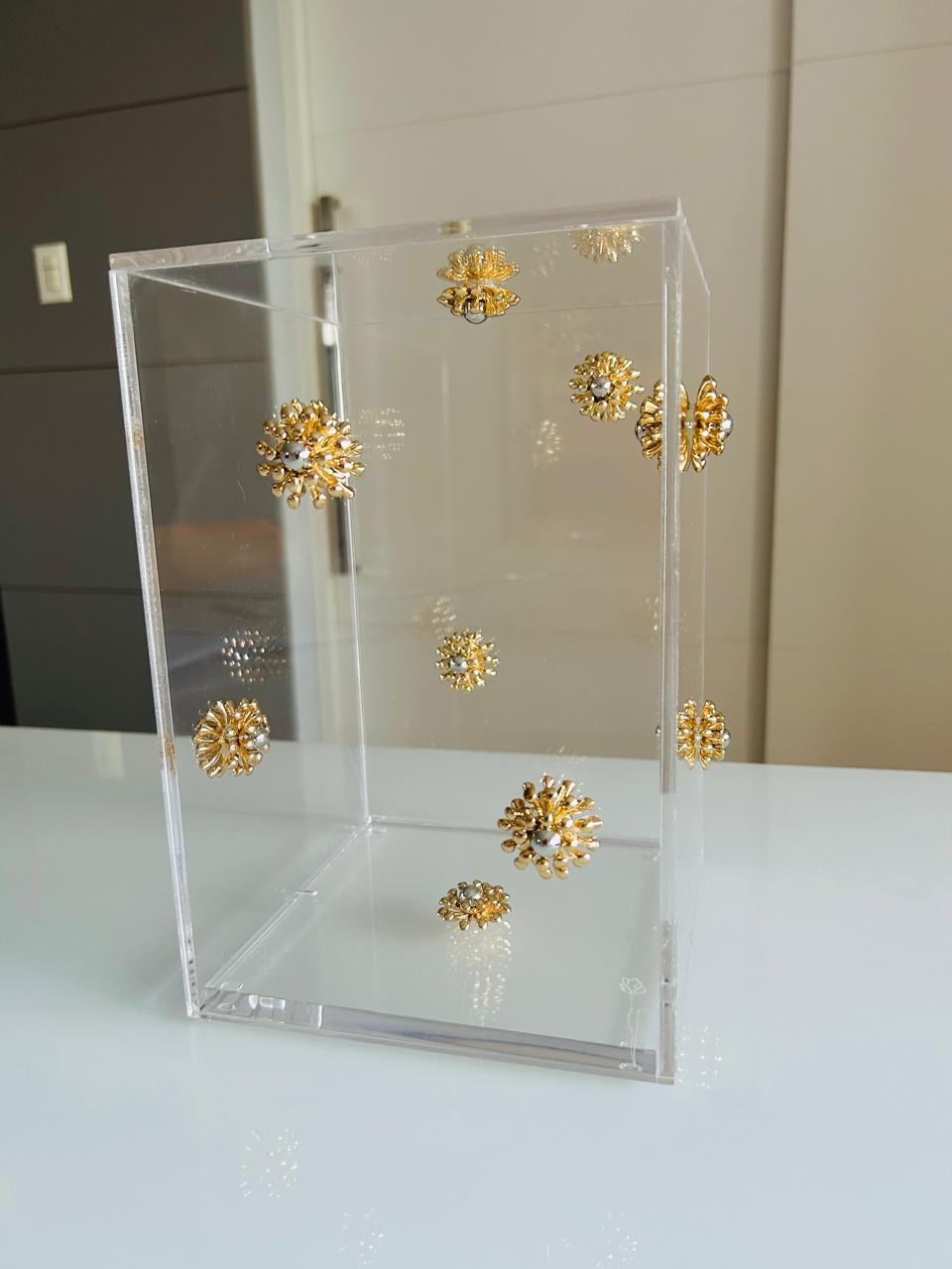 Cubo em acrílico transparente com 19 apliques em metal dourado em formato de Astros.