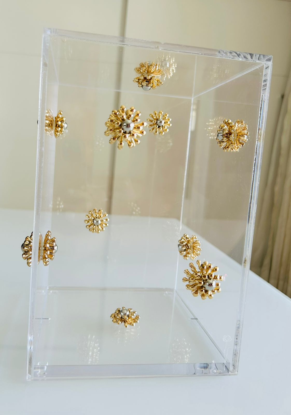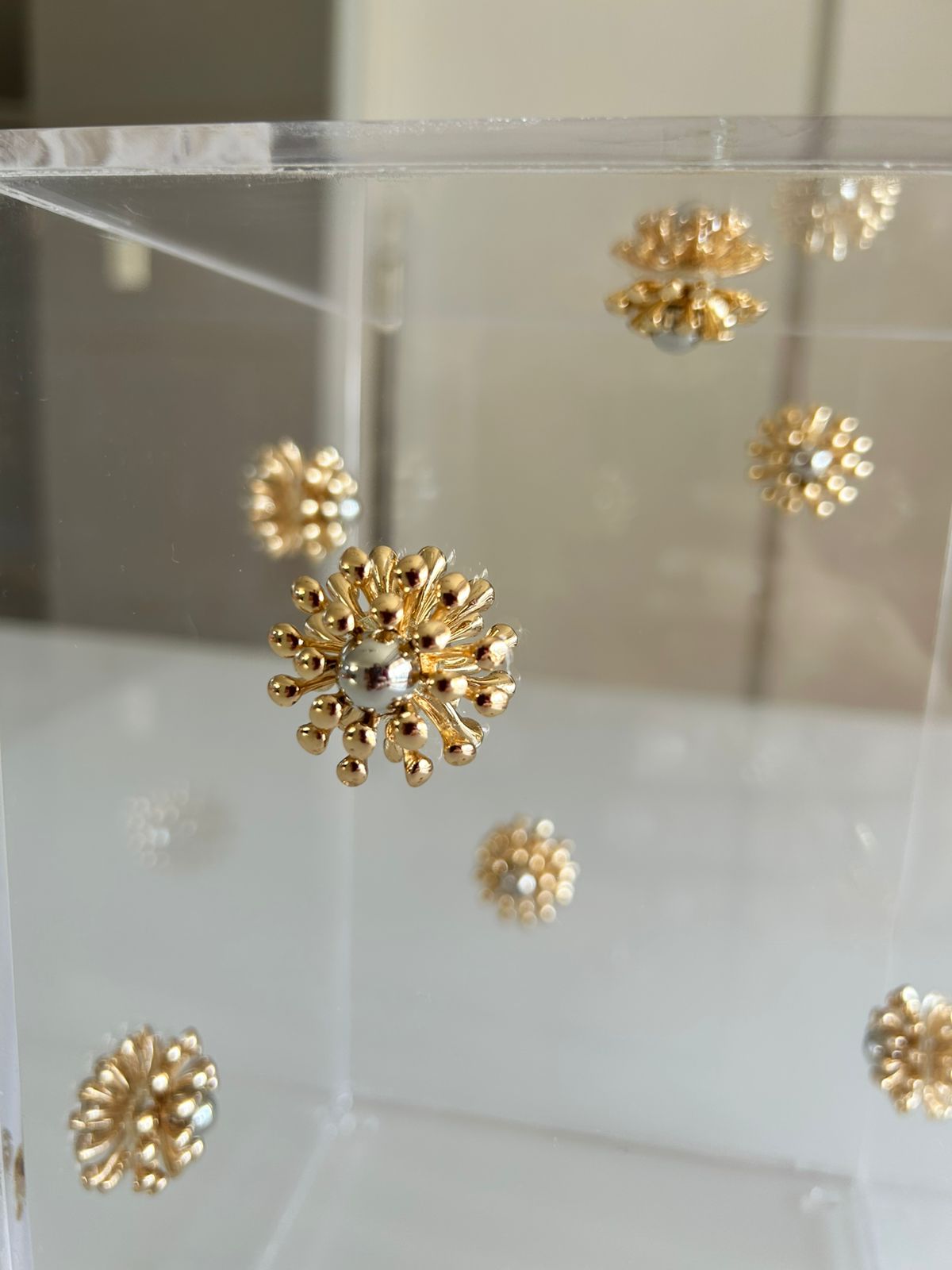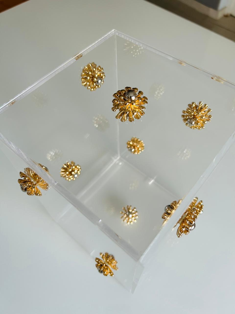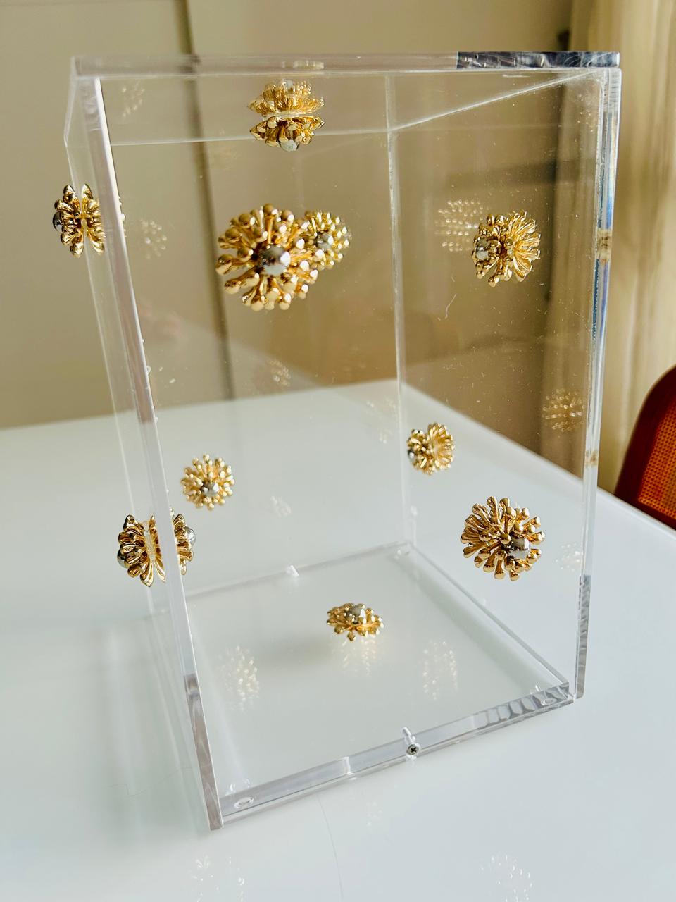 Cubo em acrílico transparente com 19 apliques em metal dourado em formato de Astros.
